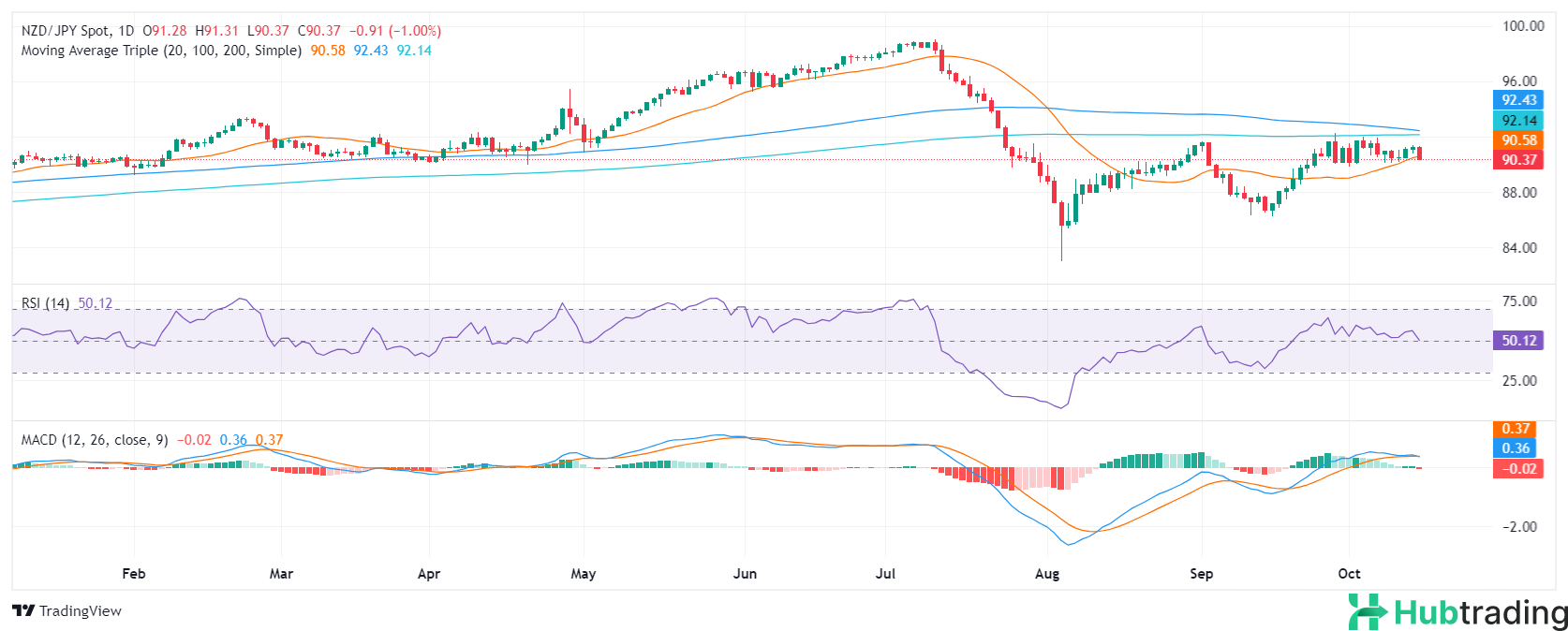 The NZD/JPY pair fell by 0.60% to 90.70 during Tuesday's session, raising concerns about a potential reversal of the recent bullish trend.