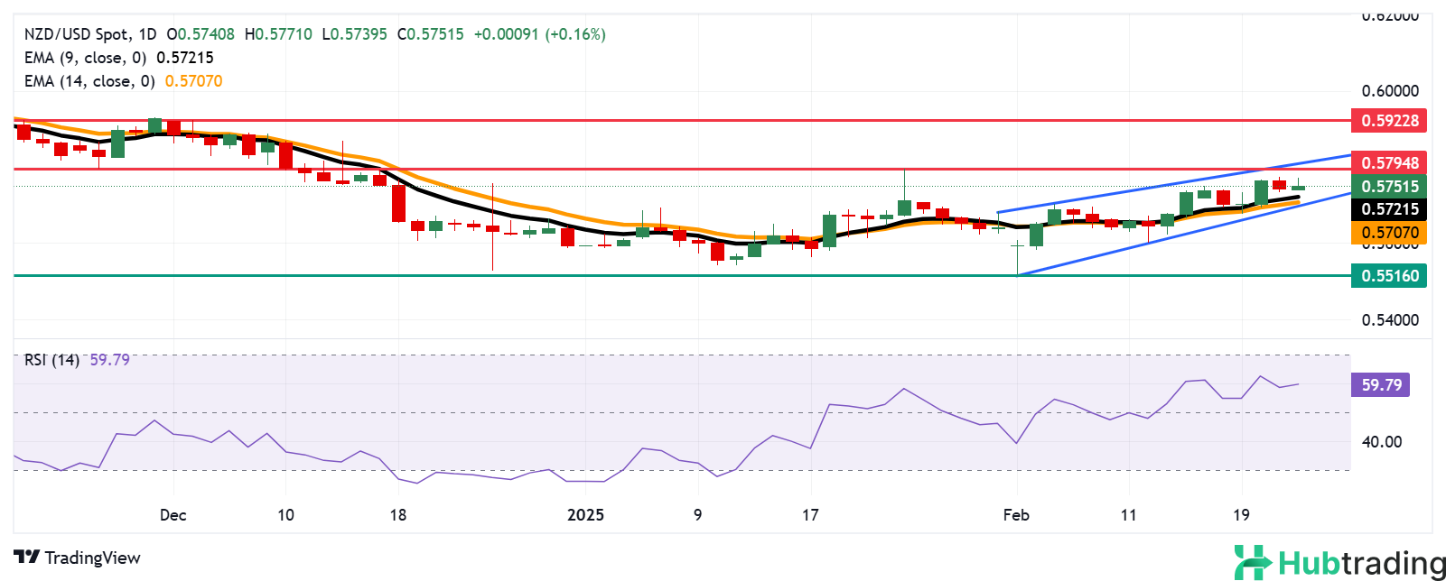 Immediate support lies at the nine-day EMA at 0.5721, with additional support at the 14-day EMA around 0.5707. The lower boundary of the ascending channel at 0.5700 serves as another key support level. A breakdown below this channel could weaken the bullish outlook, exposing NZD/USD to further downside toward 0.5516, its lowest level since October 2022, reached on February 3.