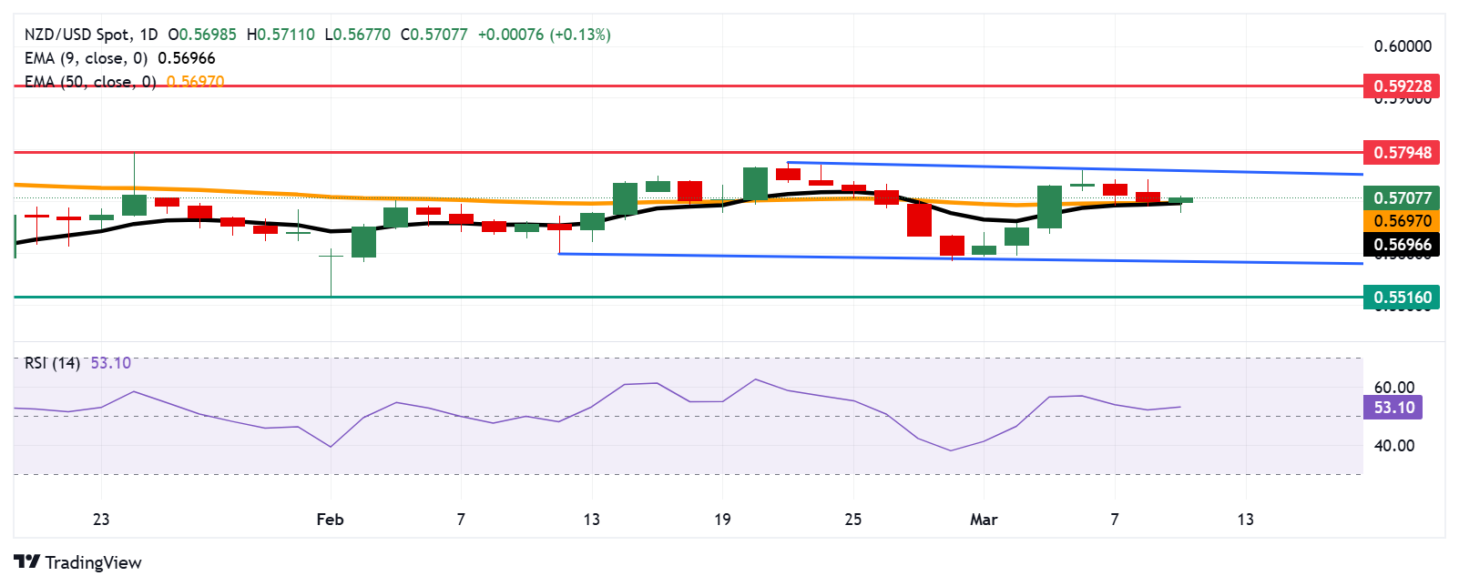 The NZD/USD pair holds its gains, recovering from daily losses and trading around 0.5710 during European trading hours on Tuesday. Technical analysis of the daily chart suggests a consolidation phase, with the pair moving within a rectangular pattern.
