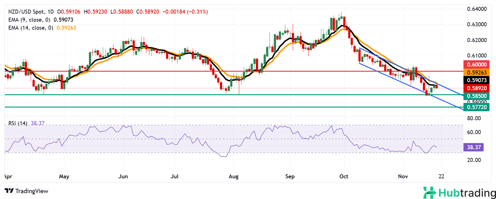 The NZD/USD pair breaks its three-day winning streak and is trading around 0.5890 during the European session on Wednesday. A closer look at the daily chart reveals a strengthening bearish bias as the pair moves lower within the descending channel pattern.