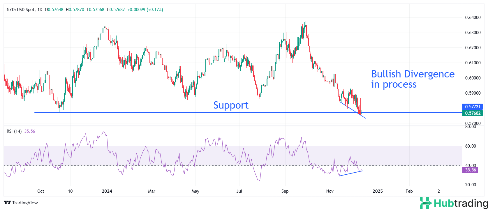 From a technical perspective, the NZD/USD daily chart reveals a potential bullish divergence, indicating waning selling momentum and the possibility of a reversal. While the pair has formed a lower low on the daily timeframe, the 14-day Relative Strength Index (RSI) shows higher lows. Confirmation of this setup could trigger a rebound, with key resistance levels at the November 29 high of 0.5930, the November 15 high of 0.5970, and the psychological barrier at 0.6000.