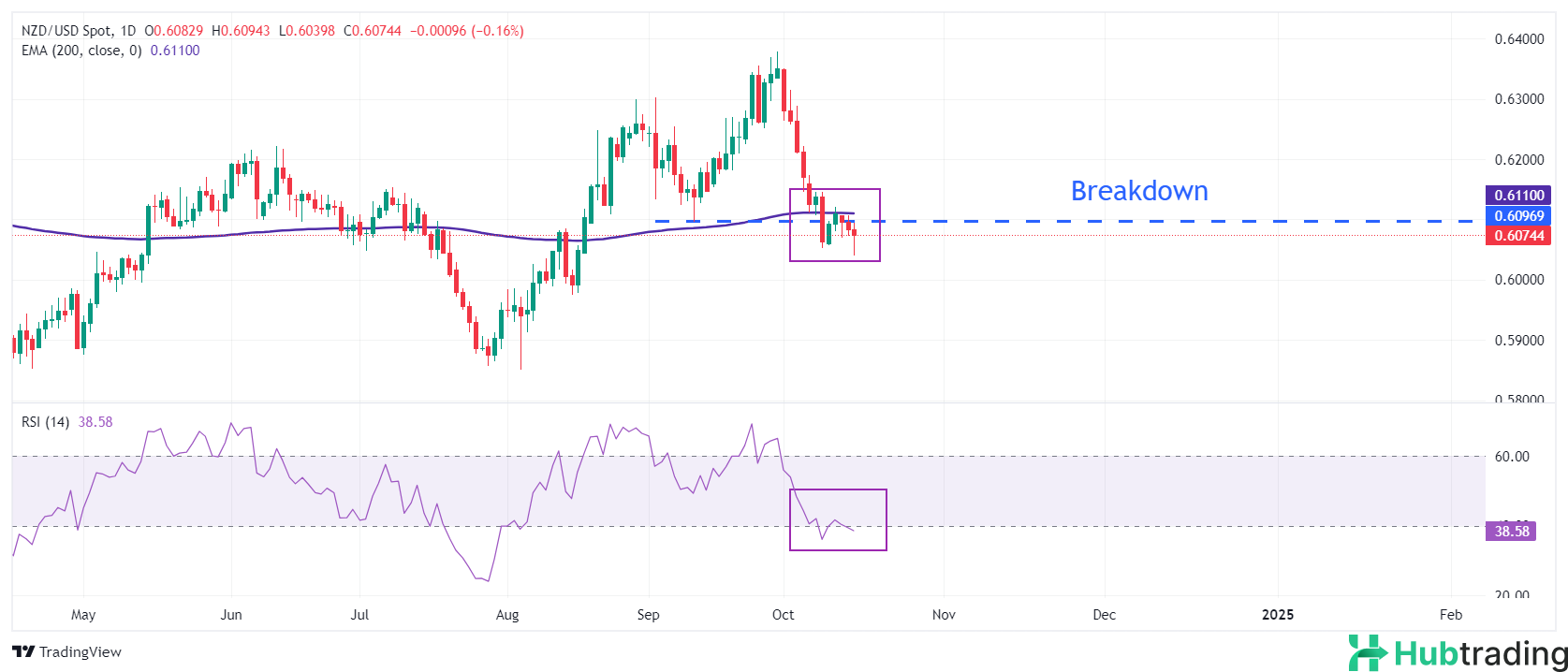The NZD/USD pair weakened after breaking below the horizontal support established from the September 11 low of 0.6100 on the daily timeframe. The overall trend has turned bearish, forming a lower swing low, with the asset now trading below the 200-day Exponential Moving Average (EMA) around 0.6100.