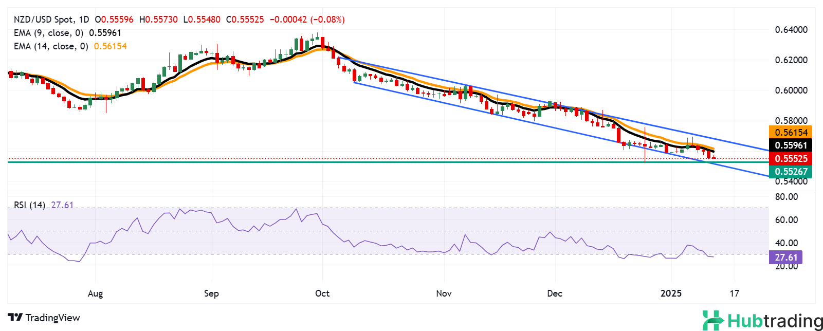 The NZD/USD pair extends its losing streak from January 7, hovering around 0.5550 during Monday's European session. Technical analysis of the daily chart highlights a sustained bearish bias as the pair trades near the lower boundary of a descending channel.