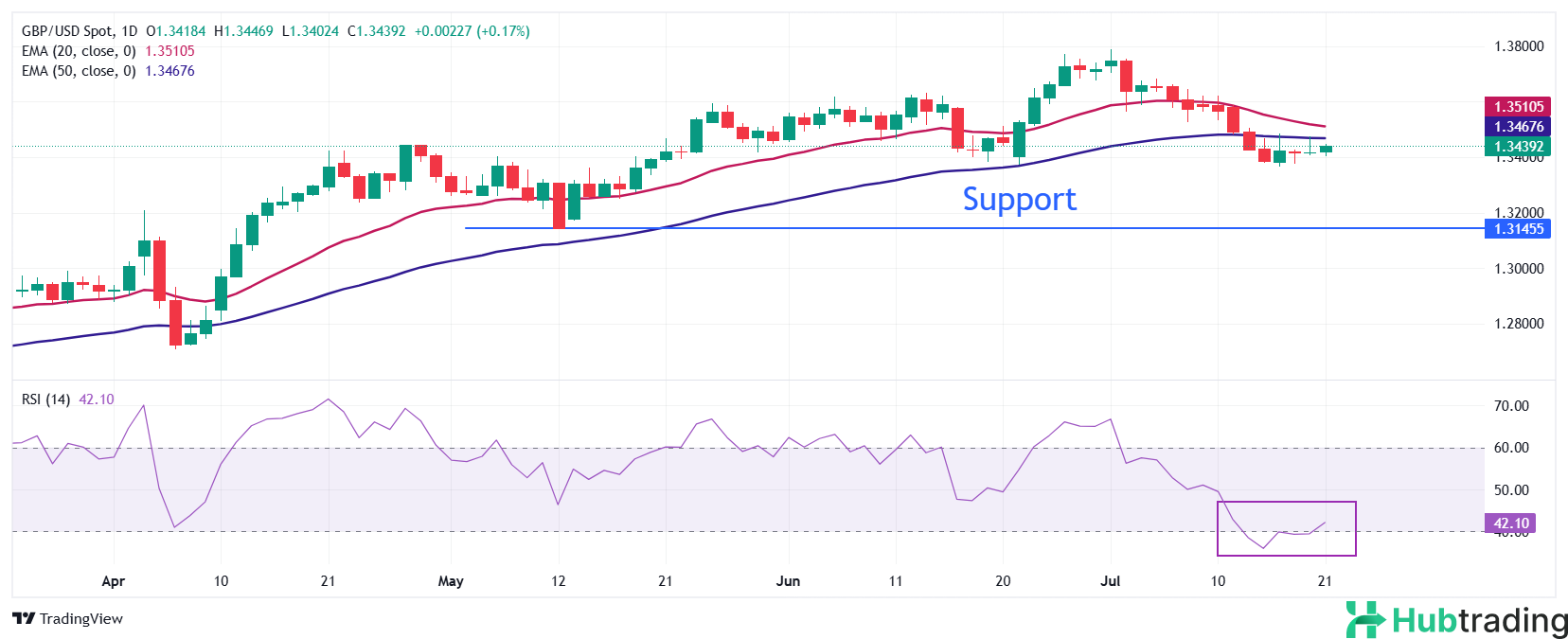 - The Pound Sterling (GBP) trades slightly higher near 1.3450 against the US Dollar (USD) during Monday’s European session, though the overall movement remains broadly sideways. The GBP/USD pair benefits from a mild pullback in the US Dollar, as investors await further clarity on US trade tariff actions ahead of the August 1 deadline.