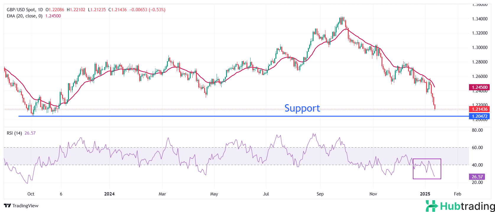 The Pound Sterling reaches a new more-than-a-year low near 1.2120 against the US Dollar during Monday’s European session, following a breakdown below the January 2 low of 1.2350. This move has intensified selling pressure on the GBP/USD pair.