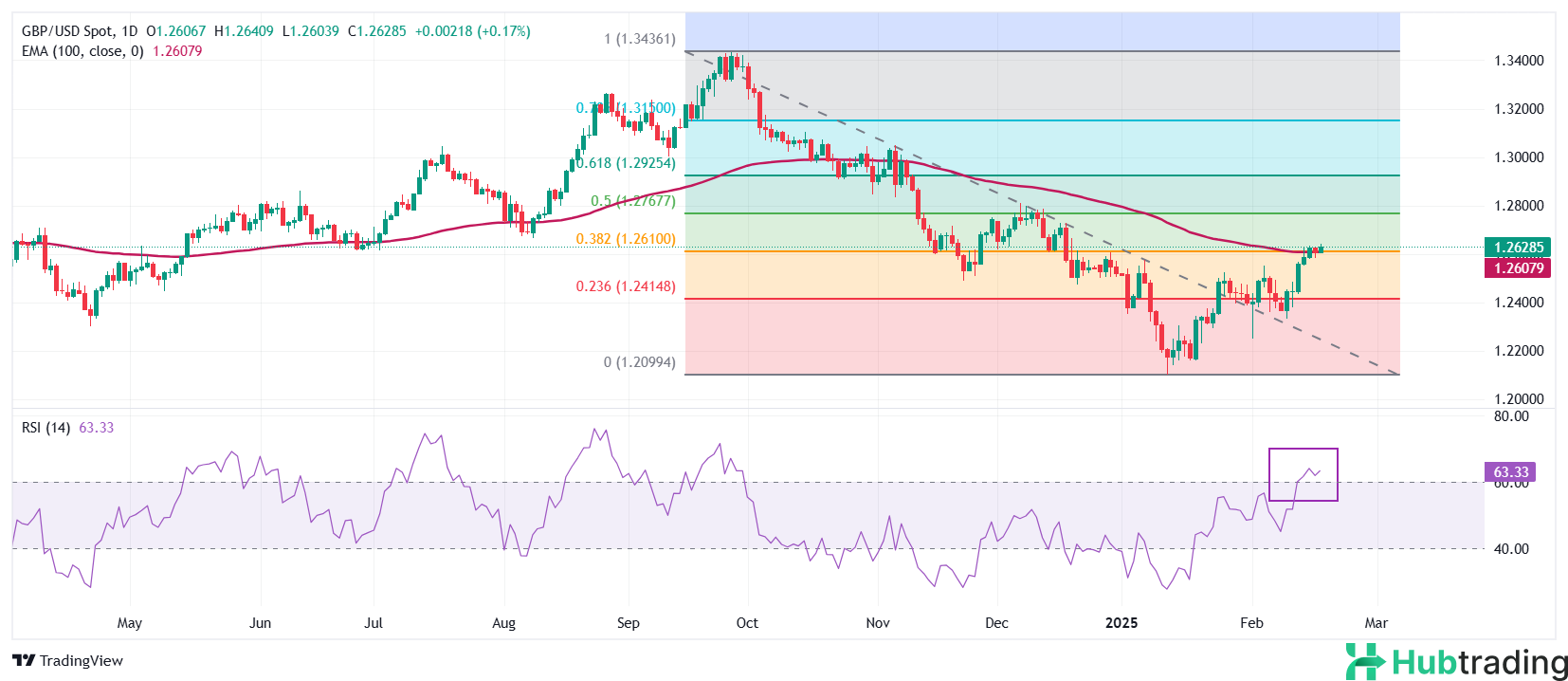 GBP/USD struggles below 1.2600, facing resistance at the 38.2% Fibonacci retracement and 100-day EMA at 1.2620.
