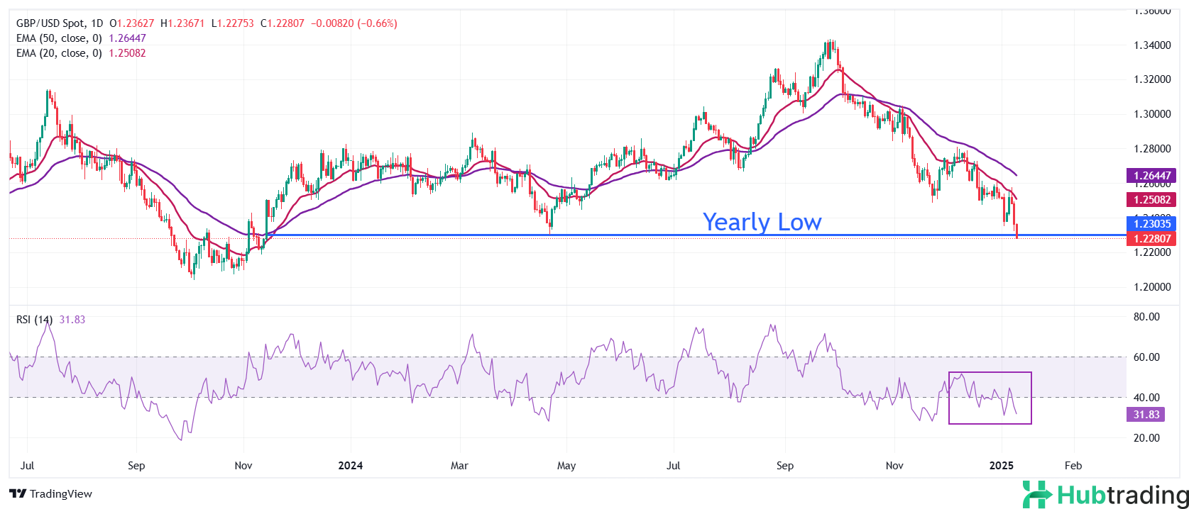 The Pound Sterling extended its decline, reaching a more-than-one-year low near 1.2250 against the US Dollar (USD) on Thursday. The GBP/USD pair faced intensified selling pressure after breaching the January 2 low of 1.2350. The broader outlook for the pair remains bearish, with the 20-day and 50-day Exponential Moving Averages (EMAs), positioned around 1.2510 and 1.2645, respectively, continuing to trend downward.