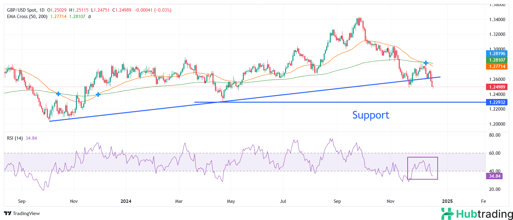 The Pound Sterling weakens against the US Dollar, breaking decisively below the upward-sloping trendline around 1.2600, which has been in place since the October 2023 low of 1.2035. The formation of a death cross, with the 50-day and 200-day Exponential Moving Averages (EMAs) near 1.2790, signals a strong bearish trend in the longer term.