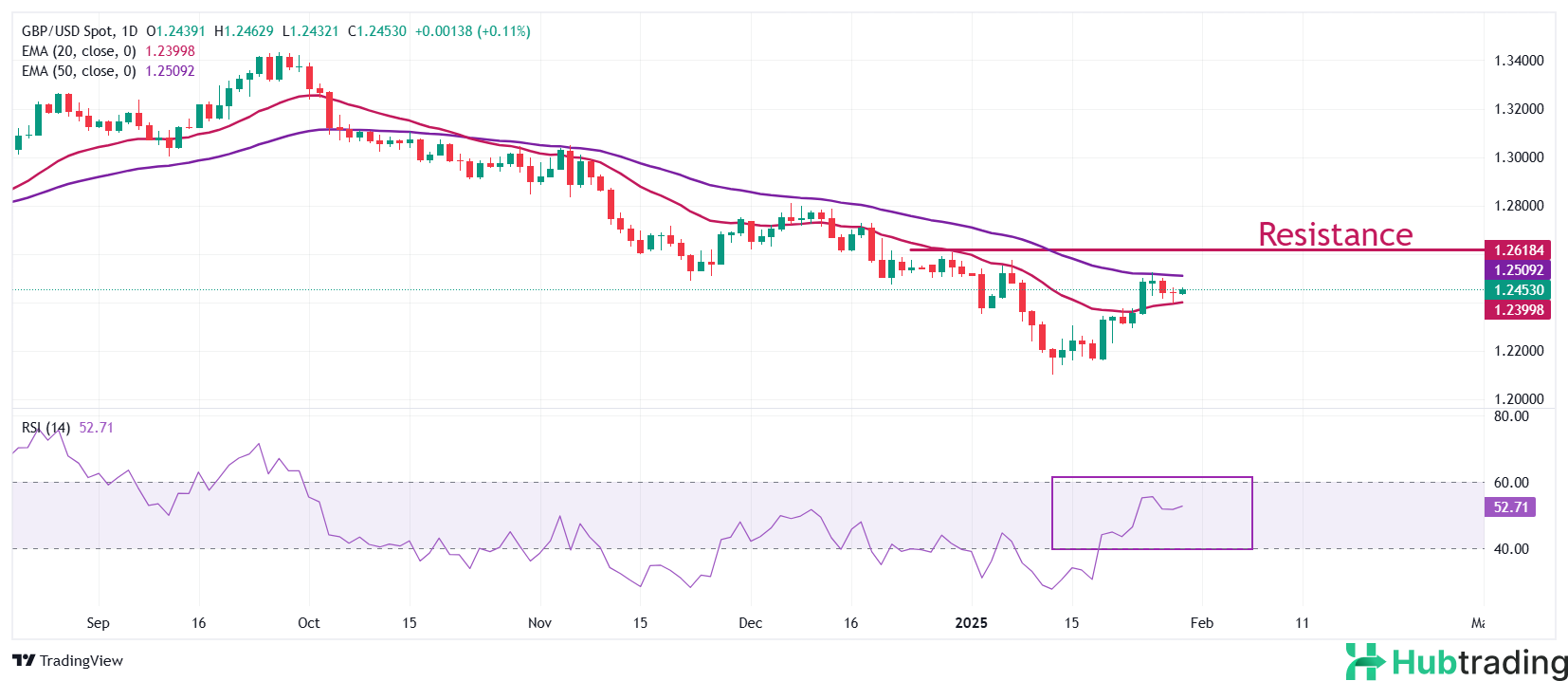 The Pound Sterling (GBP) remains under pressure against the US Dollar (USD), fluctuating around 1.2450 on Thursday. Despite recent consolidation, the GBP/USD pair maintains a firm near-term outlook, holding above the 20-day Exponential Moving Average (EMA) at 1.2400. However, the 50-day EMA at 1.2510 continues to act as a strong resistance level, limiting further upside movement.