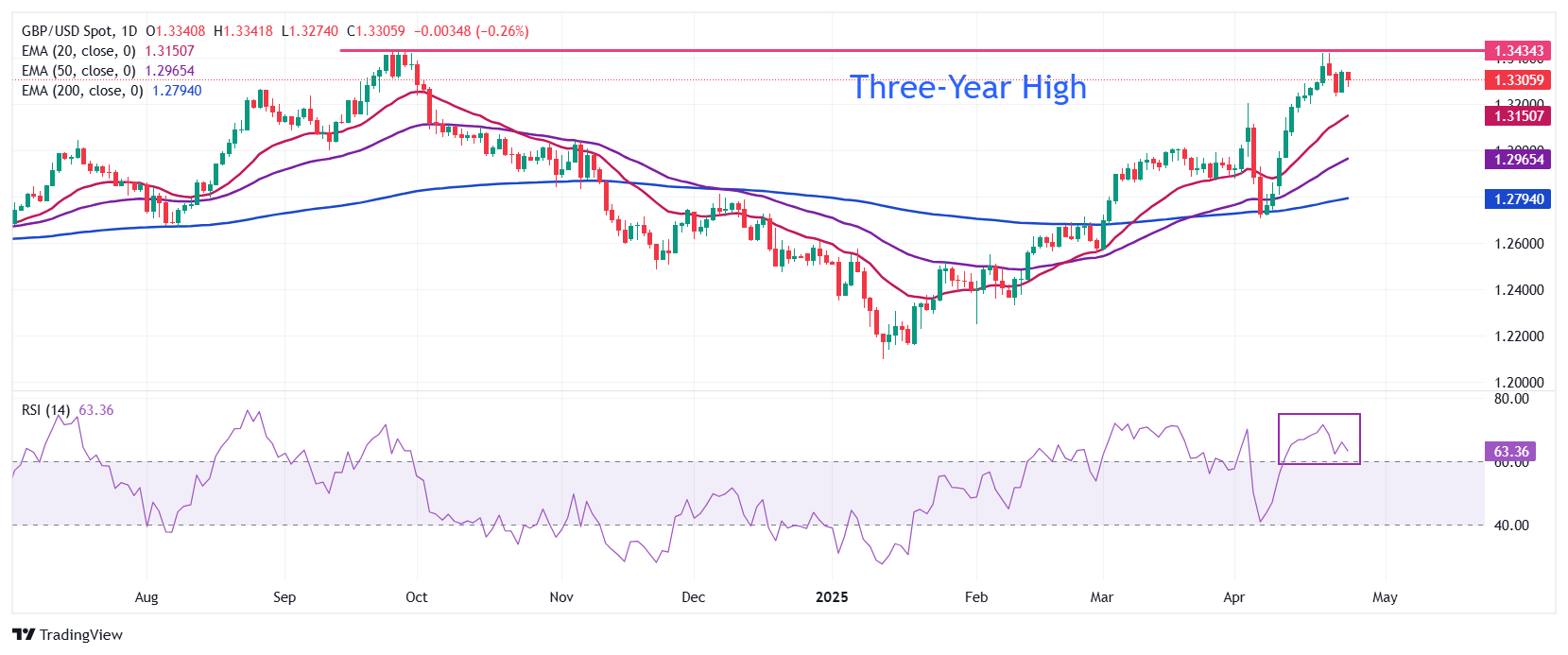 On the upside, the next major resistance lies at the psychological level of 1.3500. On the downside, initial support is seen near the April 3 high around 1.3200, which could provide a firm base if the pair dips further.