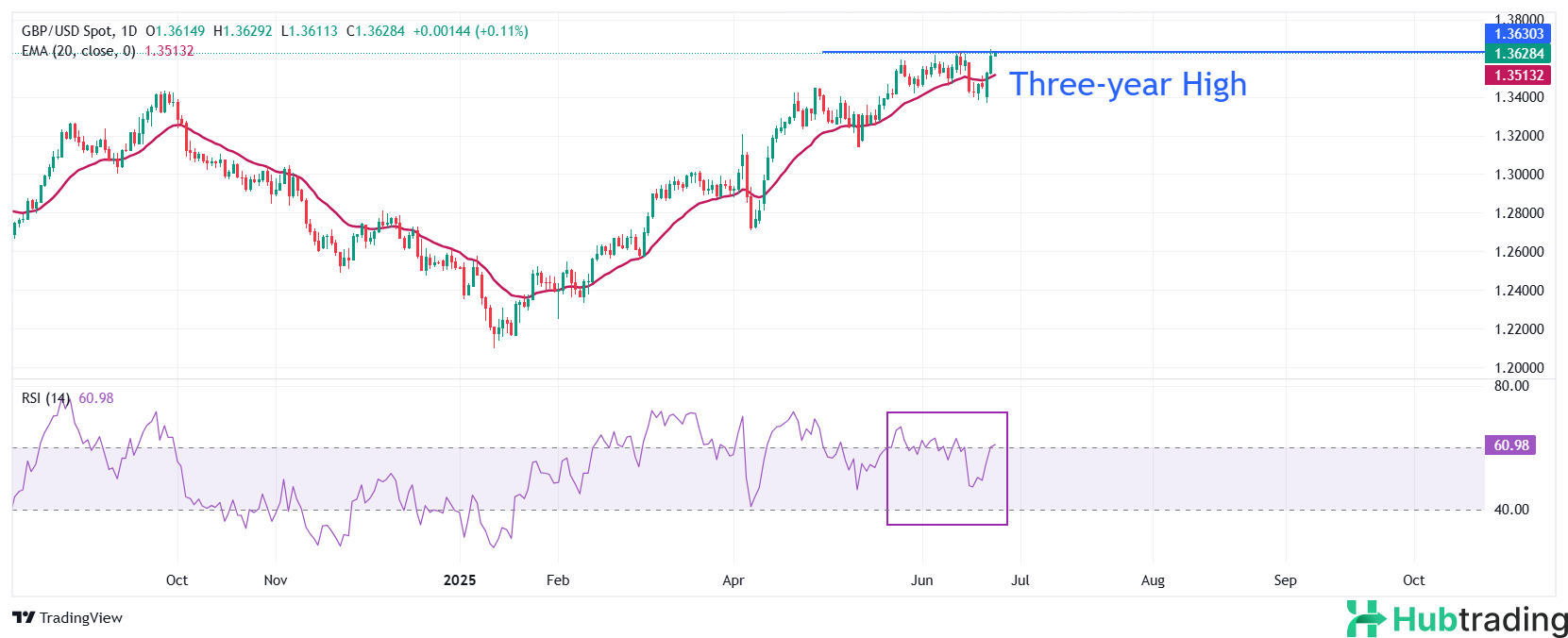 The Pound Sterling (GBP) extends its gains, trading near a fresh three-year high around 1.3650 against the US Dollar (USD) during Wednesday’s European session. The GBP/USD pair remains supported as the US Dollar continues to weaken, with safe-haven demand retreating following Tuesday’s announcement of a ceasefire between Israel and Iran.