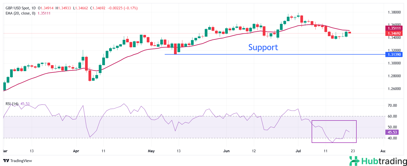 The GBP/USD pair is hovering near 1.3470 on Tuesday, staying within Monday’s trading range. The short-term bias remains bearish, especially after the pair faced selling pressure from the 20-day Exponential Moving Average (EMA) around the 1.3500 mark.