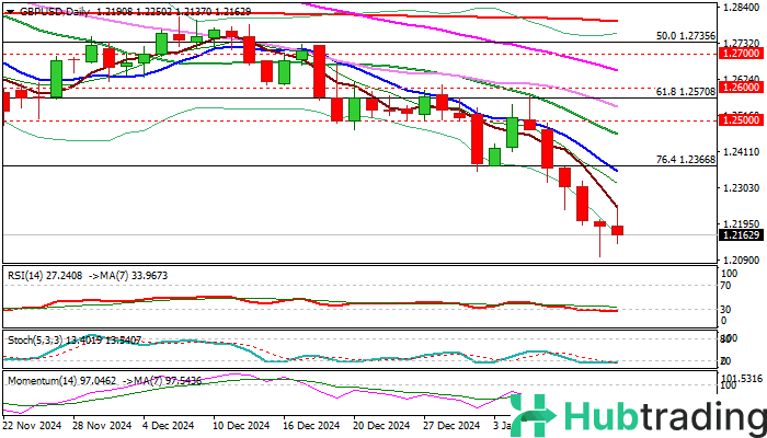 Bears have regained control, and a break below the 1.2099 low (which also marks the monthly cloud base) could open the door to testing the 1.2037/00 area (the October 4, 2023 low and a psychological level). Daily technical indicators remain in a bearish setup, although oversold conditions could temporarily stall further downside movement.