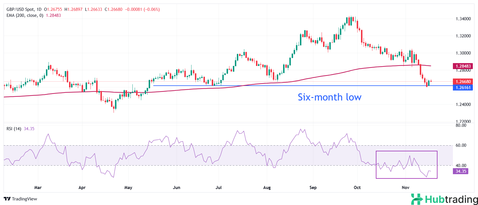 - The Pound Sterling (GBP) maintains its recovery against the US Dollar (USD), trading near 1.2680 during London trading hours on Tuesday. The GBP/USD pair rebounded after hitting a fresh six-month low near 1.2600, as the US Dollar’s rally shows signs of stalling following its recent year-to-date high. The US Dollar Index (DXY), which measures the Greenback’s value against six major currencies, is retreating from the 107.00 level.