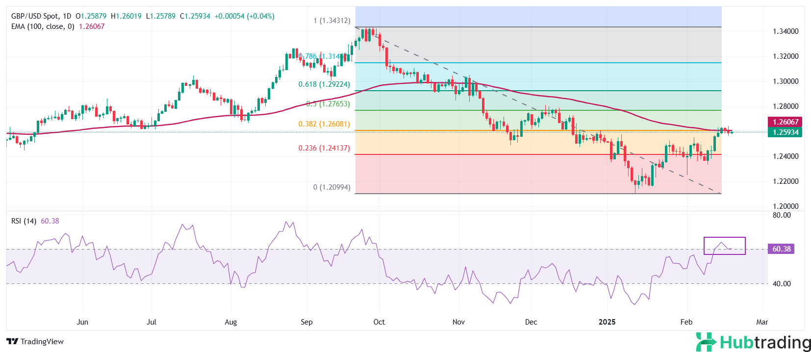 The Pound Sterling (GBP) hovers around 1.2600 against the US Dollar (USD) during Thursday’s European session, facing resistance near the 100-day Exponential Moving Average (EMA) at 1.2620. This level aligns with the 38.2% Fibonacci retracement, measured from the late-September high to the mid-January low.
