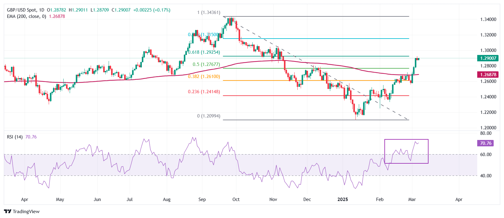 GBP/USD breaks above the 61.8% Fibonacci retracement level at 1.2930, confirming a bullish trend. The pair remains above the 200-day Exponential Moving Average (EMA) at 1.2688, while the 14-day Relative Strength Index (RSI) rises above 60.00, indicating strong bullish momentum.