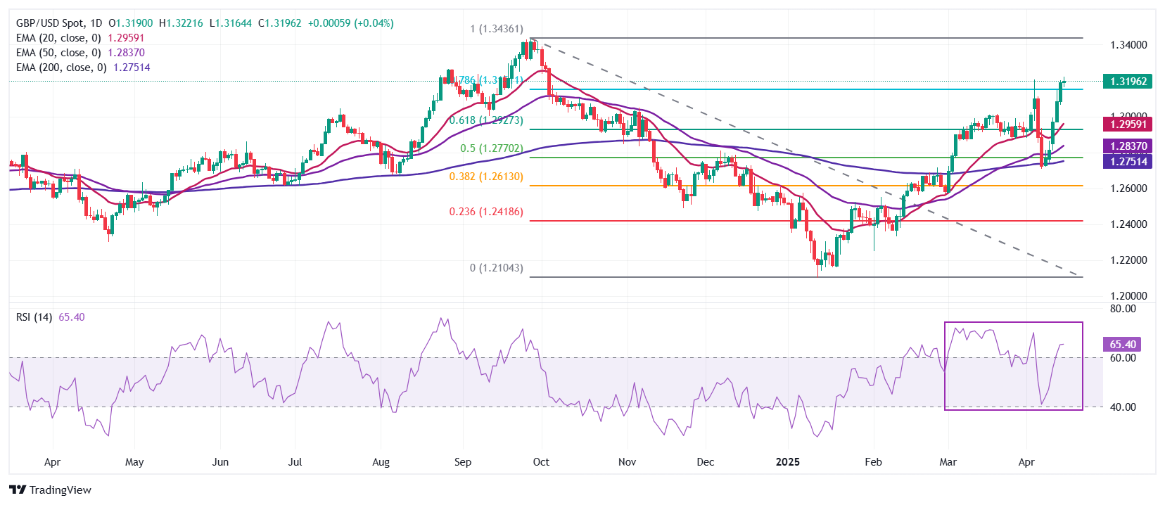 The GBP/USD pair has now posted gains for six consecutive trading sessions, rising above the 1.3200 level. The short- and long-term technical outlook remains bullish, with the price trading above all major Exponential Moving Averages (EMAs). The 14-day Relative Strength Index (RSI) shows a V-shaped recovery, climbing from 40.00 to 65.00—suggesting strong upward momentum.