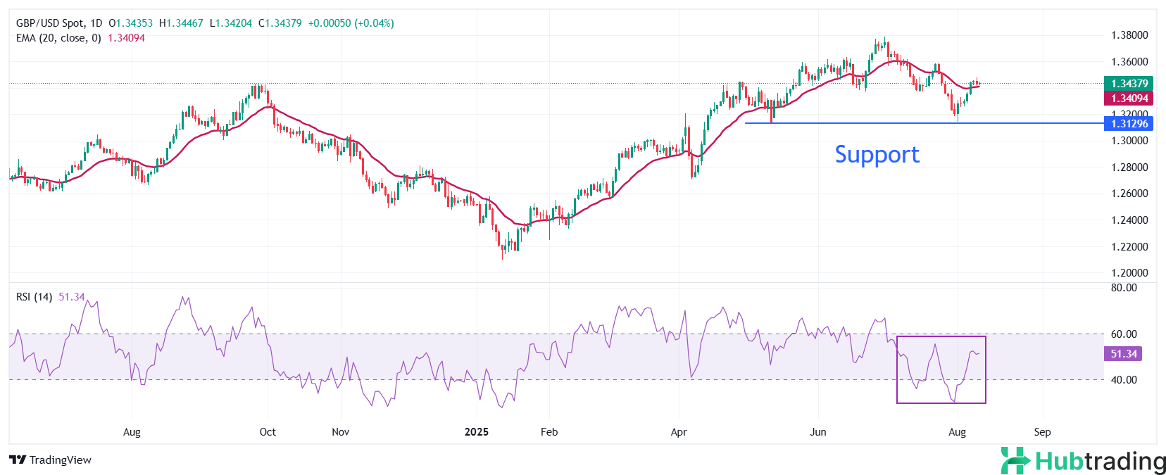 The GBP/USD pair remains stable around 1.3440, holding above the 20-day Exponential Moving Average (EMA), which is currently around 1.3408—indicating a short-term bullish bias.