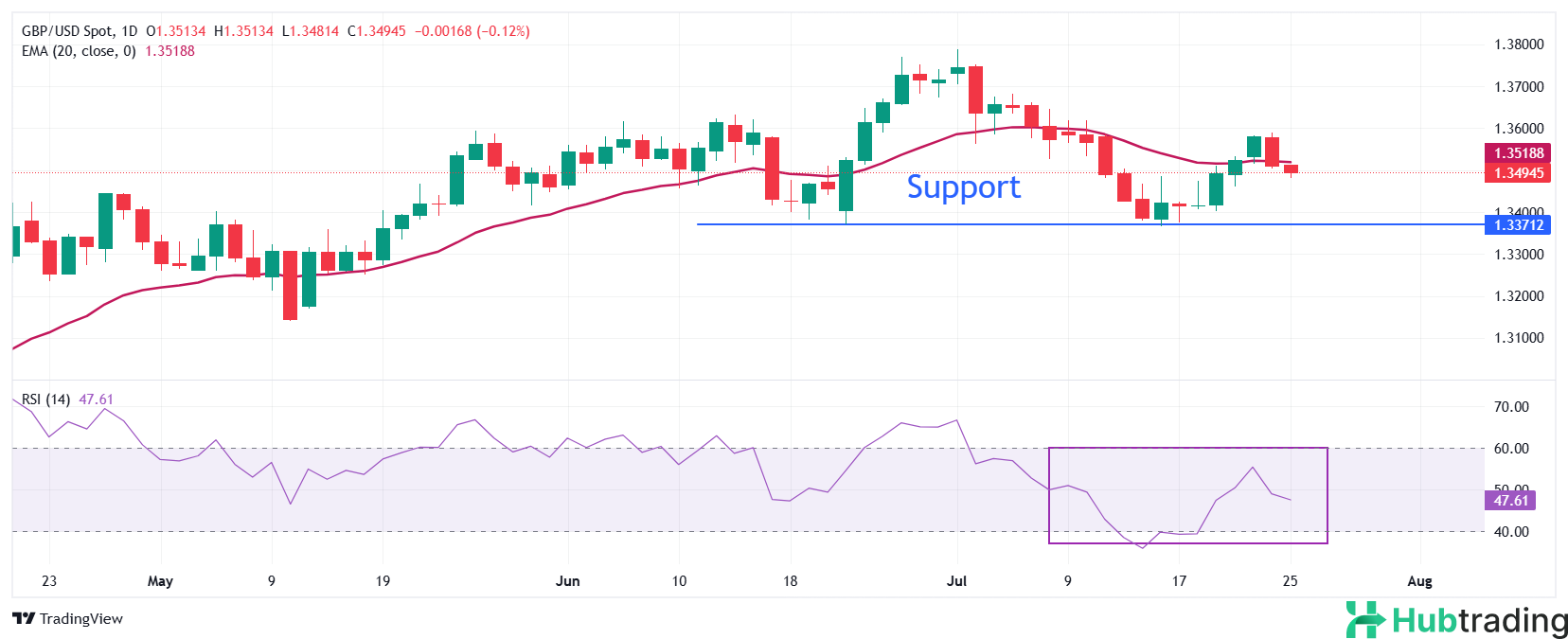 The Pound Sterling extended its pullback to 1.3480 on Friday after failing to sustain gains above 1.3600 earlier in the week. The GBP/USD pair has slipped back below the 20-day Exponential Moving Average (EMA), suggesting a weakening short-term outlook and confirming a bearish near-term bias.