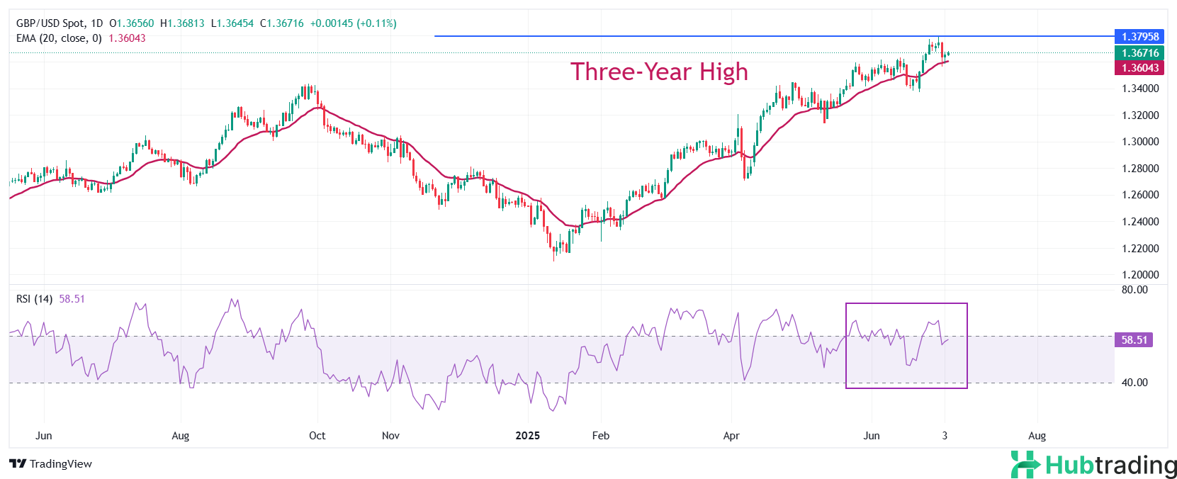 The Pound Sterling is trading slightly higher around 1.3675 against the US Dollar on Friday, with price action supported by the 20-day Exponential Moving Average (EMA), currently near 1.3600. This zone remains a key support area for the GBP/USD pair.