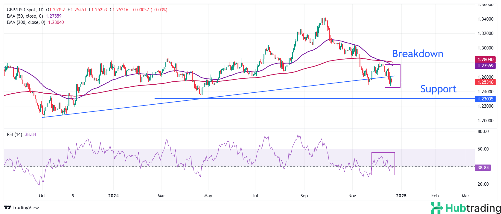 The Pound Sterling continues to face pressure against the US Dollar, having broken below the upward-sloping trendline around 1.2600, drawn from the October 2023 low of 1.2035.