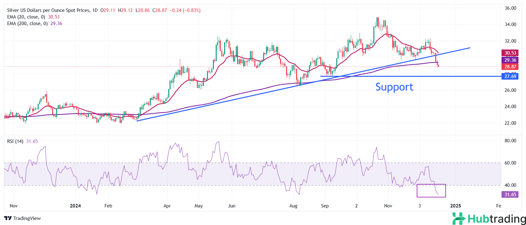 In its recent policy meeting, the Fed lowered key borrowing rates by 25 basis points (bps) to 4.25%-4.50%, signaling fewer rate cuts for 2025. The Fed’s updated dot plot now sees Federal Fund rates at 3.9% by 2025, up from the 3.4% previously projected. Ahead of the PCE data, the US Dollar Index (DXY) has eased from its two-year high at 108.50, while 10-year US Treasury yields have dipped to 4.56% from a six-month peak of 4.60%. This pullback in yields slightly reduces the opportunity cost of holding non-yielding assets like silver.