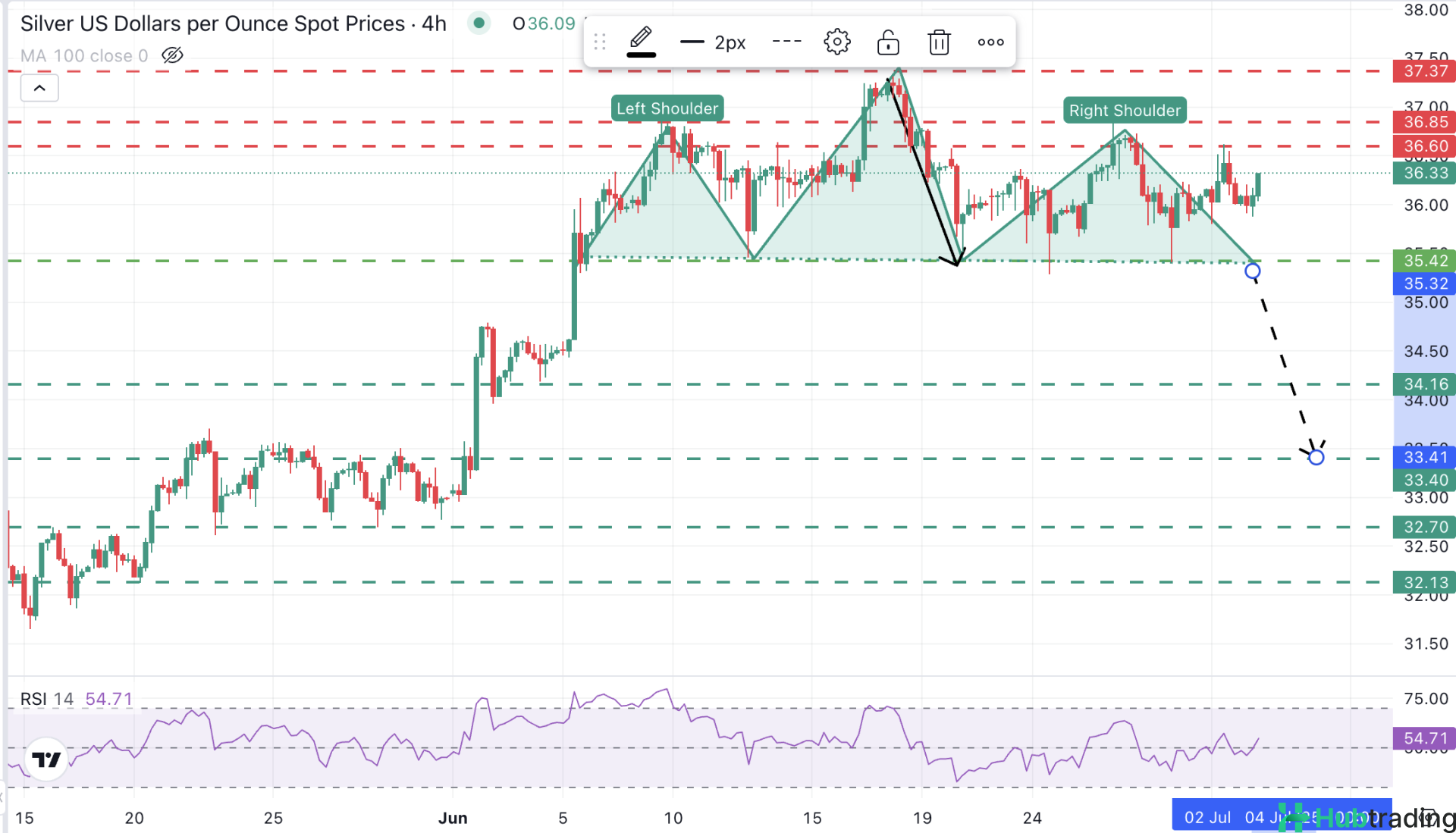 To the downside, a break below $35.40 would confirm a bearish Head & Shoulders pattern, potentially accelerating losses toward $34.10 (June 4 low) and the pattern’s projected target of $33.43.