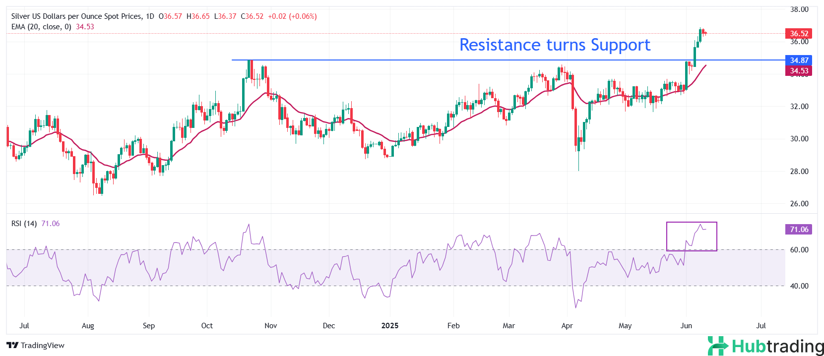 Silver’s rally has taken a breather after reaching a fresh multi-year high near $36.90. Despite the current consolidation, the broader technical outlook remains bullish. The 20-day Exponential Moving Average (EMA), currently around $34.50, continues to trend upward, indicating ongoing upward momentum.