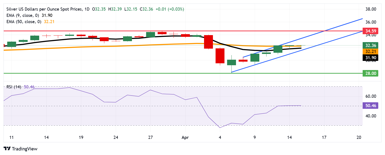 To the downside, immediate support is located at the 50-day EMA around $32.21, followed by the 9-day EMA near $31.90. A drop below these levels may suggest fading momentum, potentially exposing the $31.50 support area. Deeper losses could see silver retreat toward the April 7 low at $28.00.
