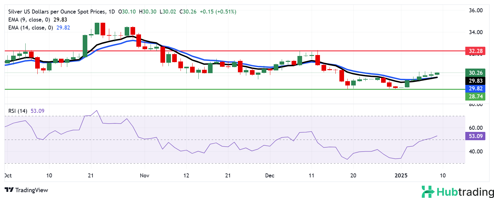 Silver prices continue to rise, extending their winning streak since January 1. As of Thursday's European session, XAG/USD trades around $30.20 per troy ounce. A closer look at the daily chart reveals a developing bullish bias, with the metal advancing along the nine- and 14-day Exponential Moving Averages (EMAs), signaling strong short-term momentum.