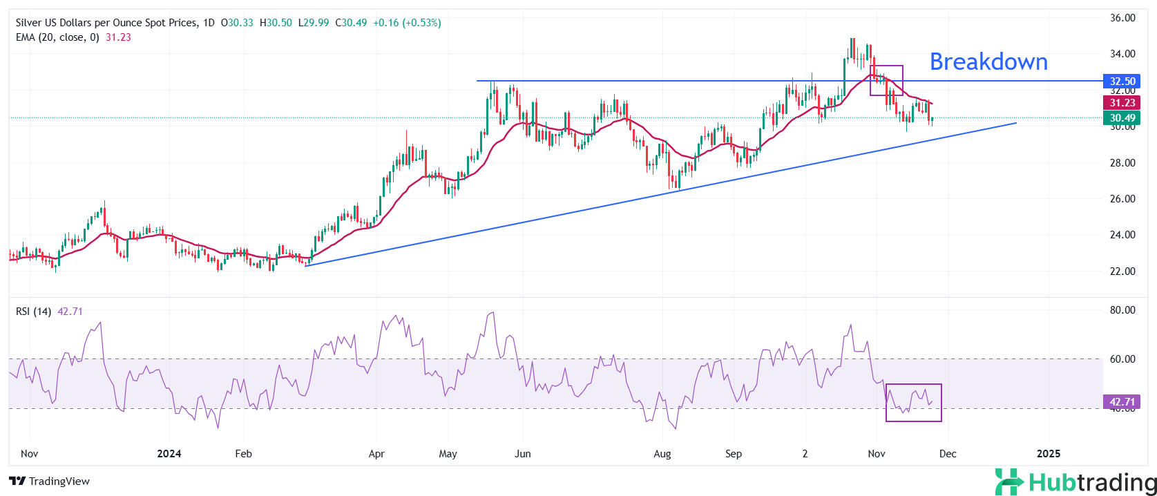 Technically, silver resumes its downward trend after briefly rising to near the 20-day Exponential Moving Average (EMA) around $31.40. The metal is expected to retreat towards the November 14 low near $29.70, following a breakdown of the horizontal support at $32.50.