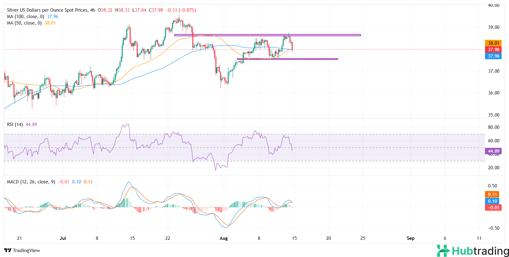 On the 4-hour chart, XAG/USD is consolidating within a defined range between resistance at $38.75 and support at $37.55, after failing to hold above the $38.50 zone during the Asian session. Earlier, the metal peaked at $38.74 — its highest level since July 25 — before encountering strong selling pressure.
