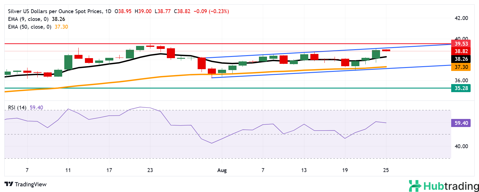 Silver (XAG/USD) dips slightly after a three-day winning streak, trading near $38.80 per troy ounce during Monday’s European session. Despite the minor pullback, the daily chart reveals the metal continues to trade within an ascending channel pattern, indicating a sustained bullish trend.