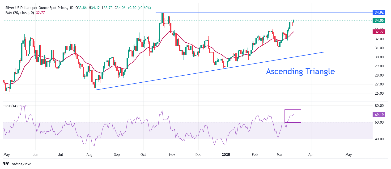 Silver (XAG/USD) climbed to a fresh four-month high of $34.10 during European trading on Tuesday, as the US Dollar (USD) weakened amid growing economic uncertainty under President Donald Trump's leadership. The US Dollar Index (DXY) dipped toward a five-month low of 103.20, reflecting investor concerns over potential economic slowdown due to new tariff policies.