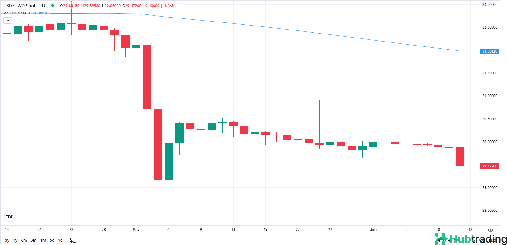 Earlier in May, USD/TWD experienced a dramatic two-day drop of nearly 10%, touching a nine-month low below 28. The pair rebounded by about 6% shortly afterward, following comments from the Governor of the Central Bank of Taiwan, who indicated that authorities had stepped in to manage what they saw as "excessive" capital inflows.