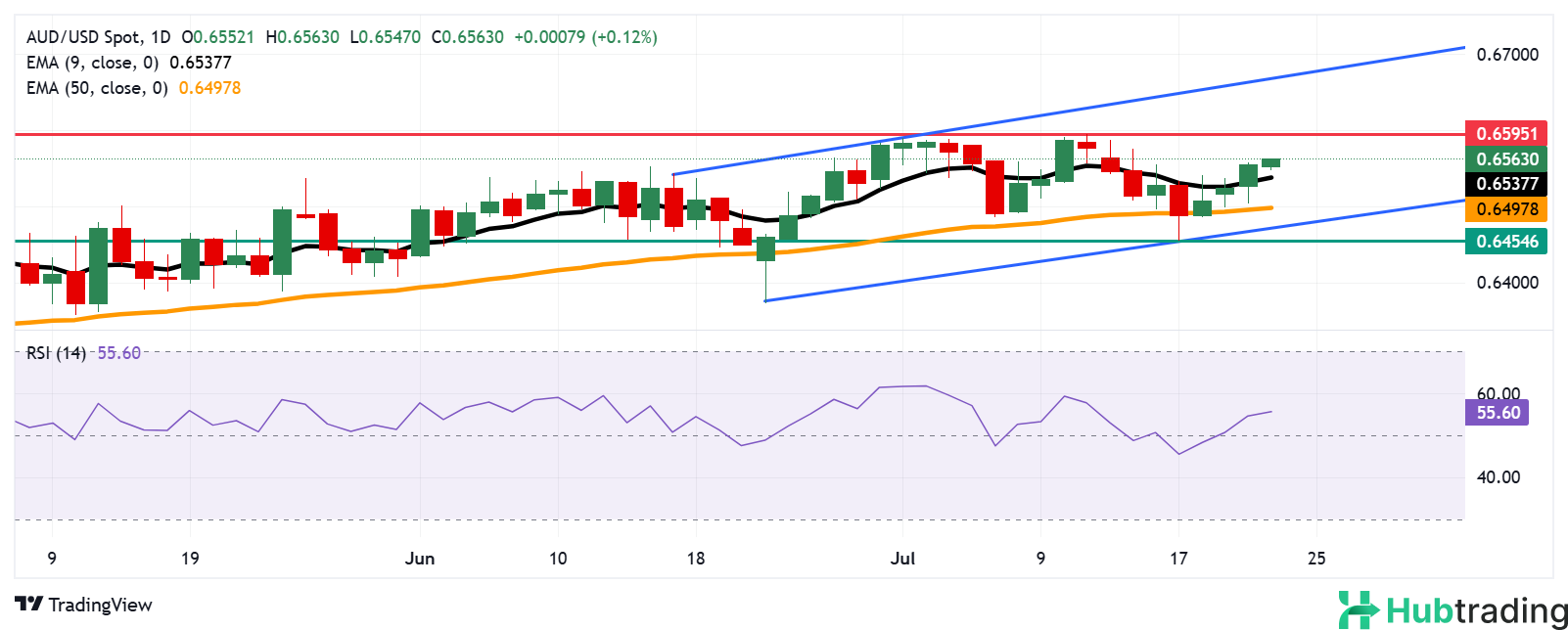 Key support lies at the nine-day EMA at 0.6537, followed by the 50-day EMA at 0.6497. A decisive break below this zone could weaken the short- to medium-term outlook and push the pair lower toward the bottom of the ascending channel near 0.6470, with further downside risk toward the three-week low at 0.6454, recorded on July 17.