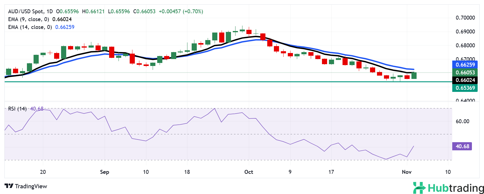 AUD/USD hovers near 0.6600 on Monday. The daily chart indicates a potential easing of bearish momentum as the pair tests the nine-day Exponential Moving Average (EMA). The 14-day Relative Strength Index (RSI), however, remains below the 50 mark; a rise above 50 could signify a momentum shift from bearish to bullish.