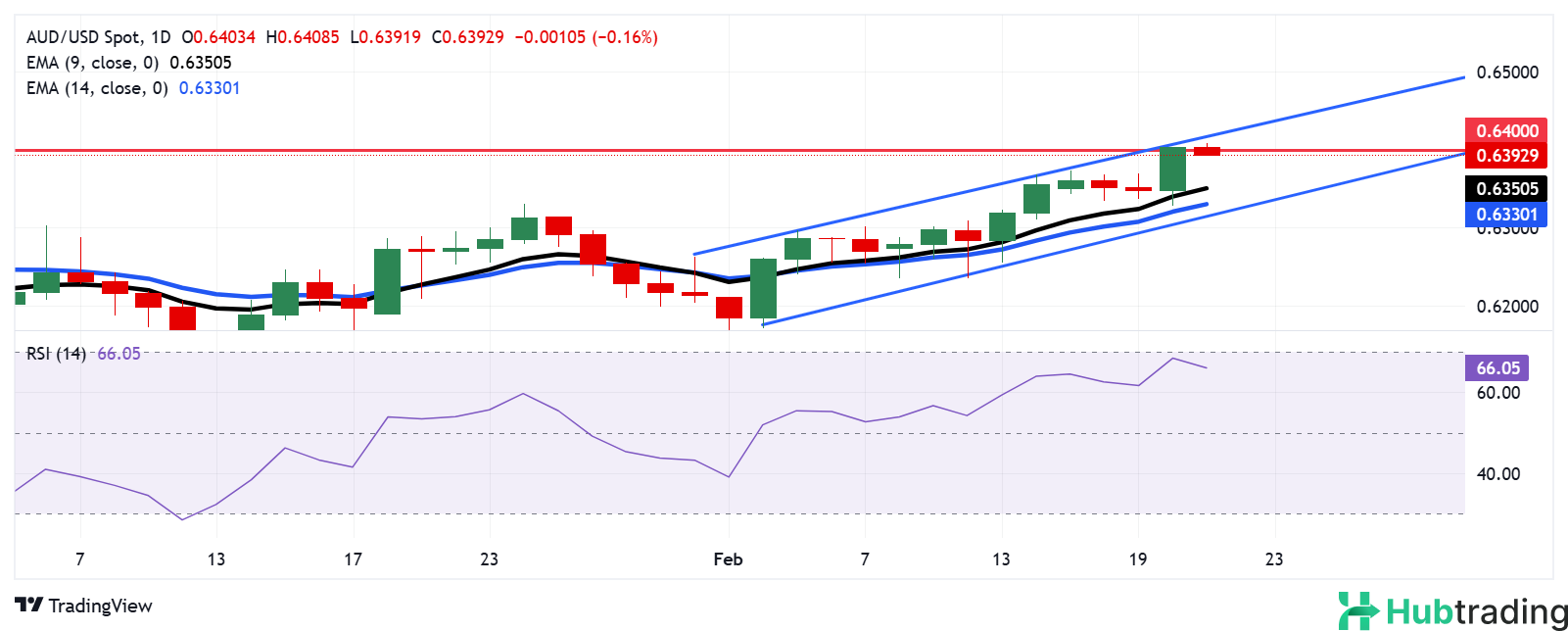 The AUD/USD pair hovers around 0.6400 on Friday, trading within an ascending channel, suggesting a bullish sentiment. The 14-day Relative Strength Index (RSI) remains above 50, reinforcing the positive outlook.
