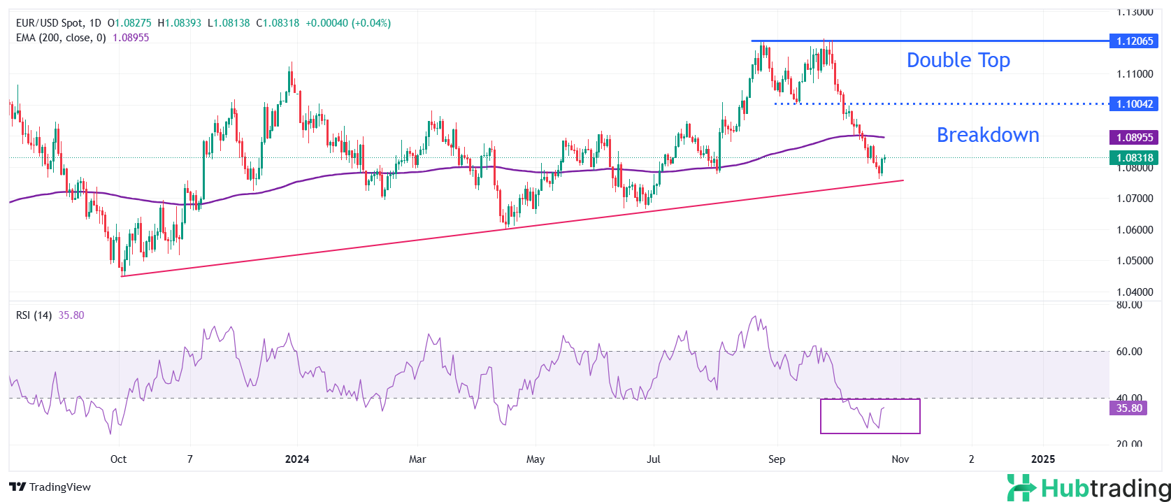 EUR/USD holds steady above 1.0800 in North American trading, though its broader outlook remains cautious as it stays below the 200-day Exponential Moving Average (EMA), currently around 1.0900. The recent bearish momentum began after a breakdown from a Double Top formation near the September 11 low at around 1.1000, signaling a downward reversal.