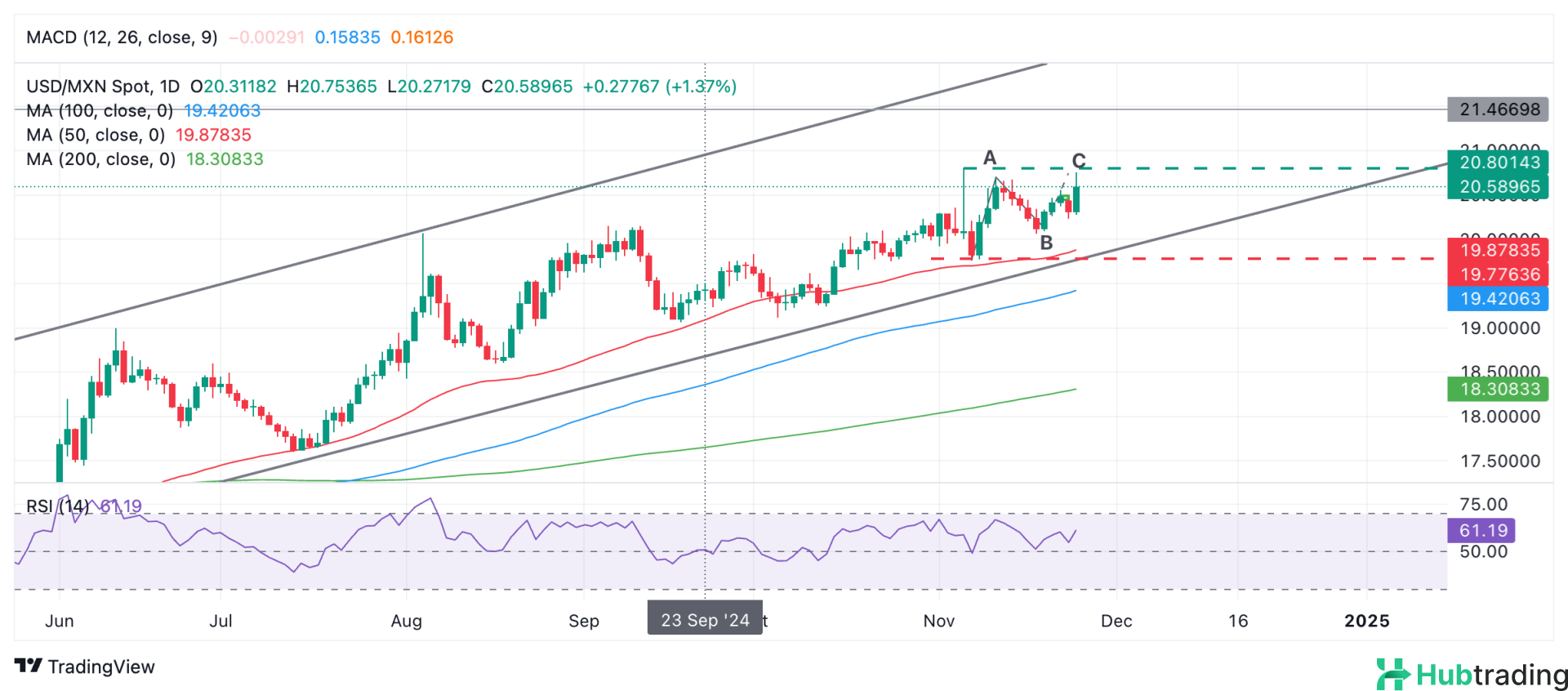 The pair has reached the C wave of a Measured Move pattern, which follows a zig-zag structure where waves A and C typically mirror each other in length. In the short term, USD/MXN is expected to remain range-bound, oscillating between 19.70 and 20.80.
