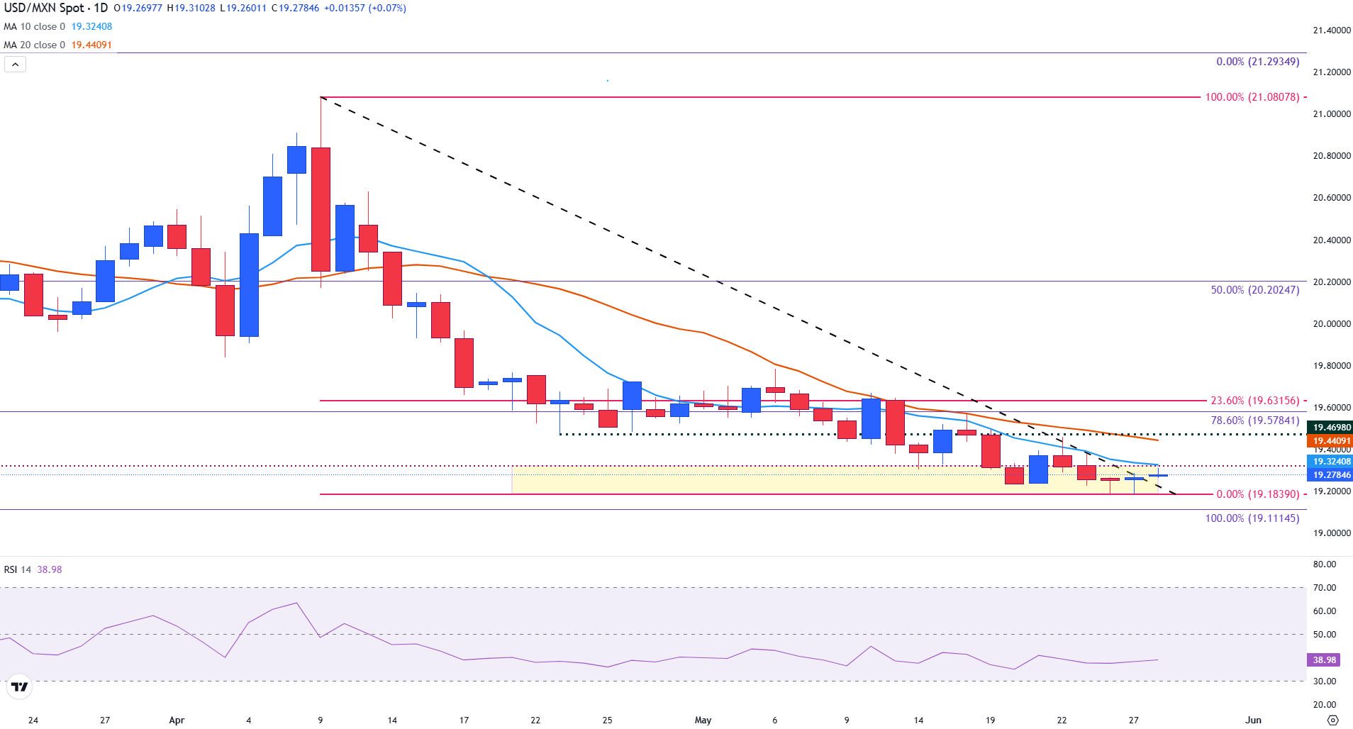 - The Mexican Peso remains in focus ahead of key economic events, with the USD/MXN pair largely driven by movements in the US Dollar. On Thursday, Mexico’s central bank, Banxico, will publish the minutes from its May 15 policy meeting, where it implemented a seventh consecutive rate cut.