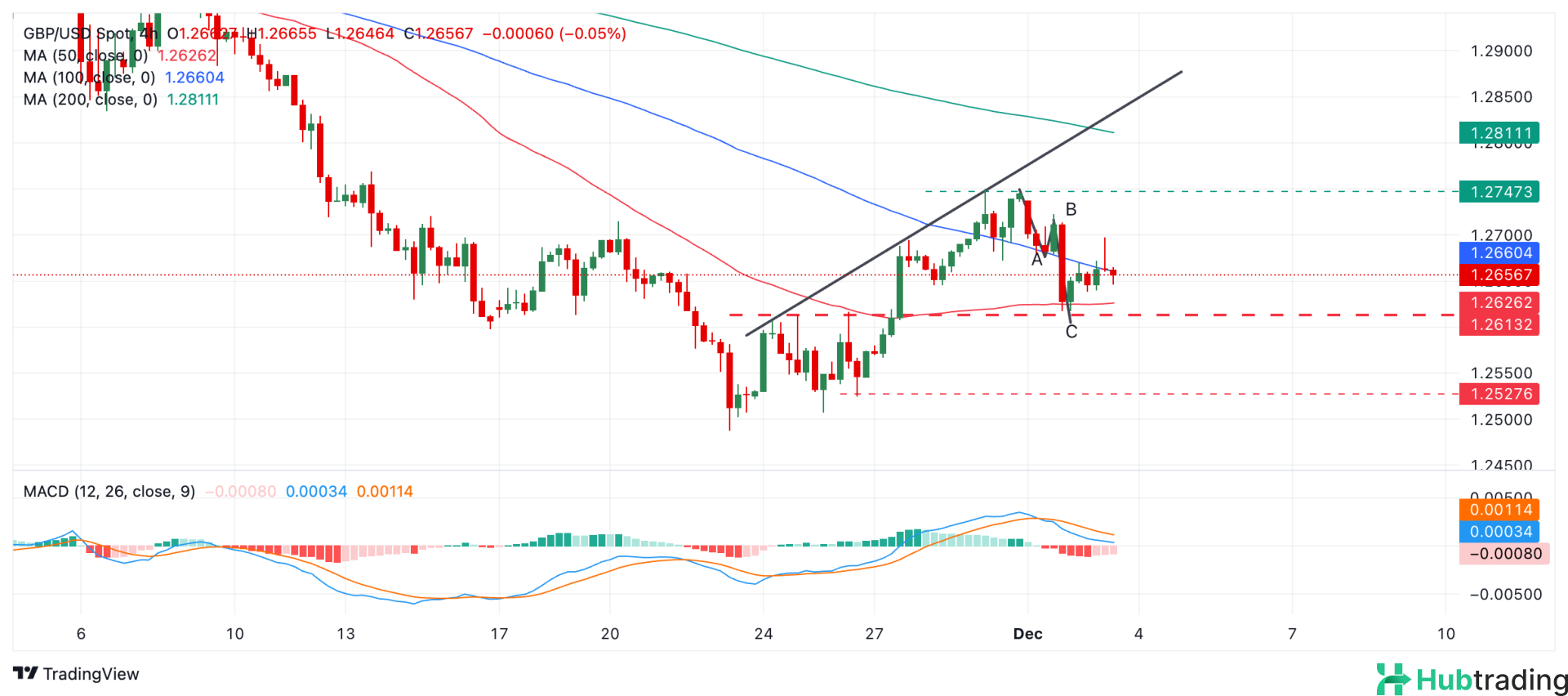 A break below 1.2617, the key support level, would confirm a reversal, opening the door to further declines toward 1.2527 and 1.2487.