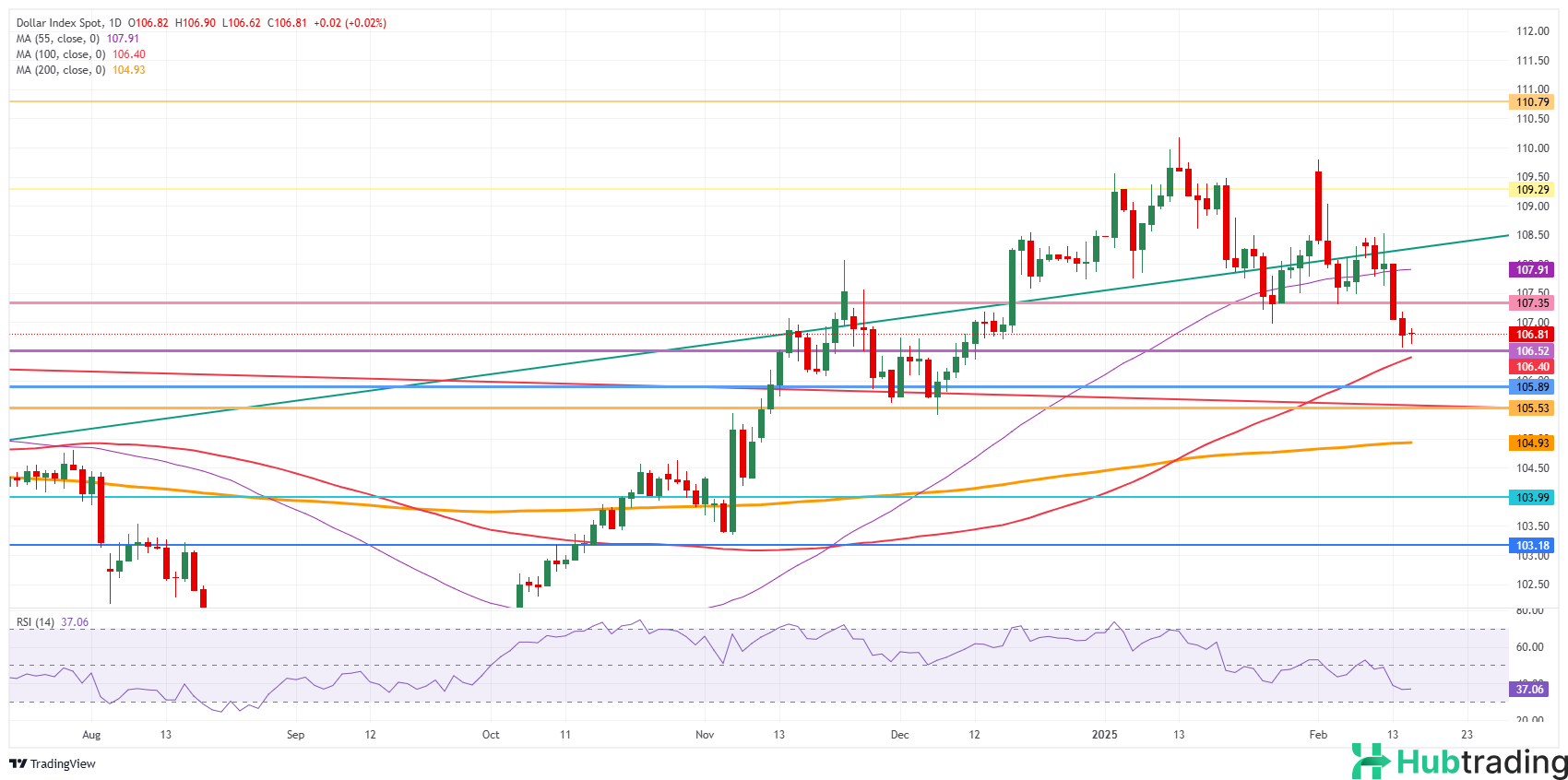 The US Dollar Index (DXY), which tracks the US Dollar’s performance against six major currencies, consolidates last week's losses and trades flat around 106.80 on Monday. With several recent data points and disappointing January Retail Sales indicating slower US economic growth, the US economy is no longer an outlier. This week, attention shifts to Riyadh, Saudi Arabia, where US and Russian officials are set to meet ahead of talks between US President Donald Trump and Russian President Vladimir Putin.