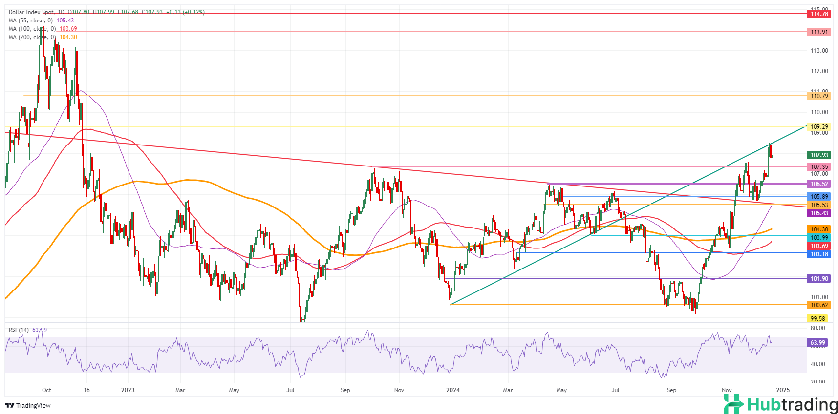 On the upside, a trendline from December 28, 2023, is acting as a cap, with the next significant resistance at 109.29, the peak from July 14, 2022, a key level to watch. Beyond that, the 110.00 round figure could become the next target.