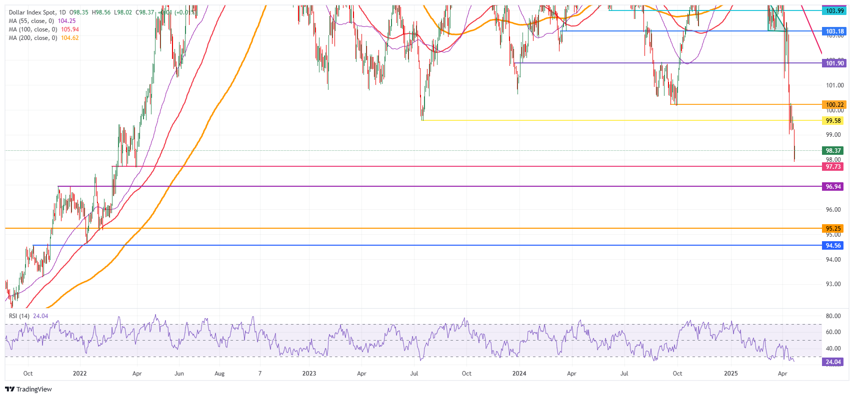 The US Dollar Index (DXY), which tracks the US Dollar's performance against six major currencies, remains broadly flat on Tuesday near a three-year low, consolidating losses from Monday. The US Dollar took a hit during Asian trading hours, with European and US markets trading on limited capacity due to the Easter Monday holiday. President Donald Trump has intensified his focus on the Federal Reserve, targeting Fed Chairman Jerome Powell, calling him a “major loser” for not lowering interest rates and exploring ways to remove Powell, further pressuring the Greenback.