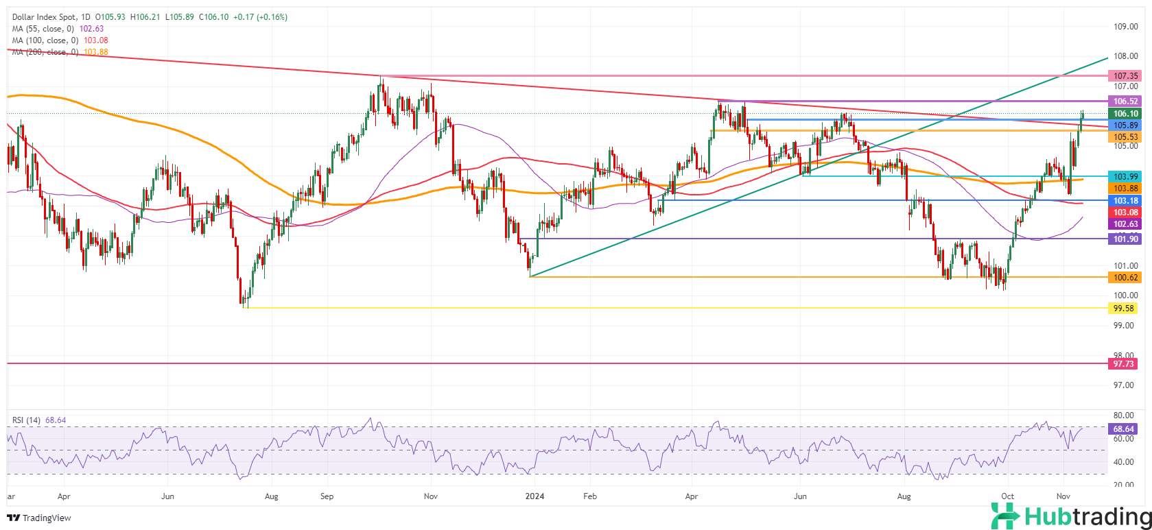 The US Dollar Index (DXY) continues its upward momentum, further building on the gains from earlier this year. This rally is in line with the higher US yields seen since the summer. However, the move could be getting overstretched, raising the likelihood of a near-term correction driven by profit-taking.