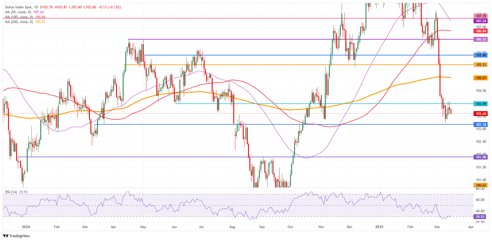 The US Dollar Index (DXY), which measures the USD’s performance against six major currencies, faces potential volatility this week amid key geopolitical events and the Federal Reserve’s (Fed) policy decision. As of Monday, the DXY edges lower, trading near 103.60 following the release of US Retail Sales data for February.