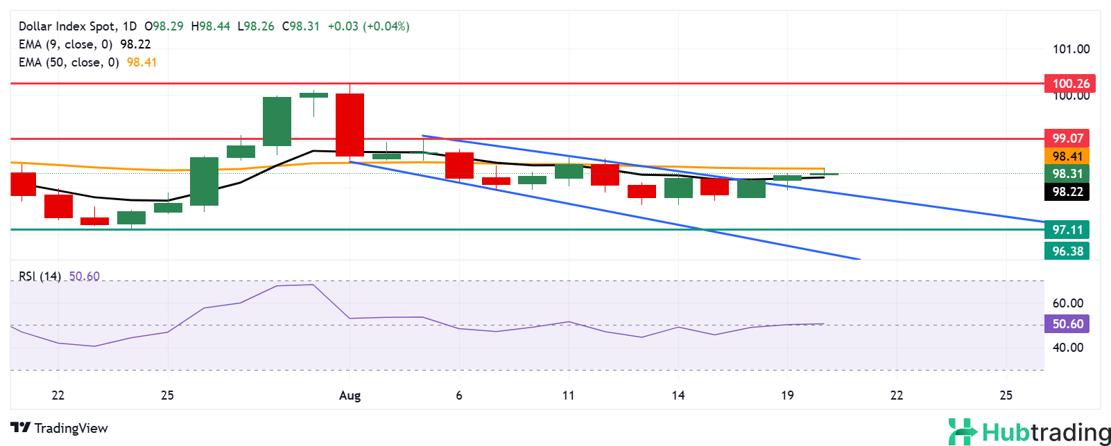 On the upside, the index is currently testing resistance at the 50-day EMA around 98.41. A sustained break above this level, followed by the 98.50 barrier, could reinforce the bullish outlook and open the path toward the three-week high of 99.07, last seen on August 5. Continued gains may push the index toward the more formidable resistance zone near the three-month high of 100.26, recorded on August 1.