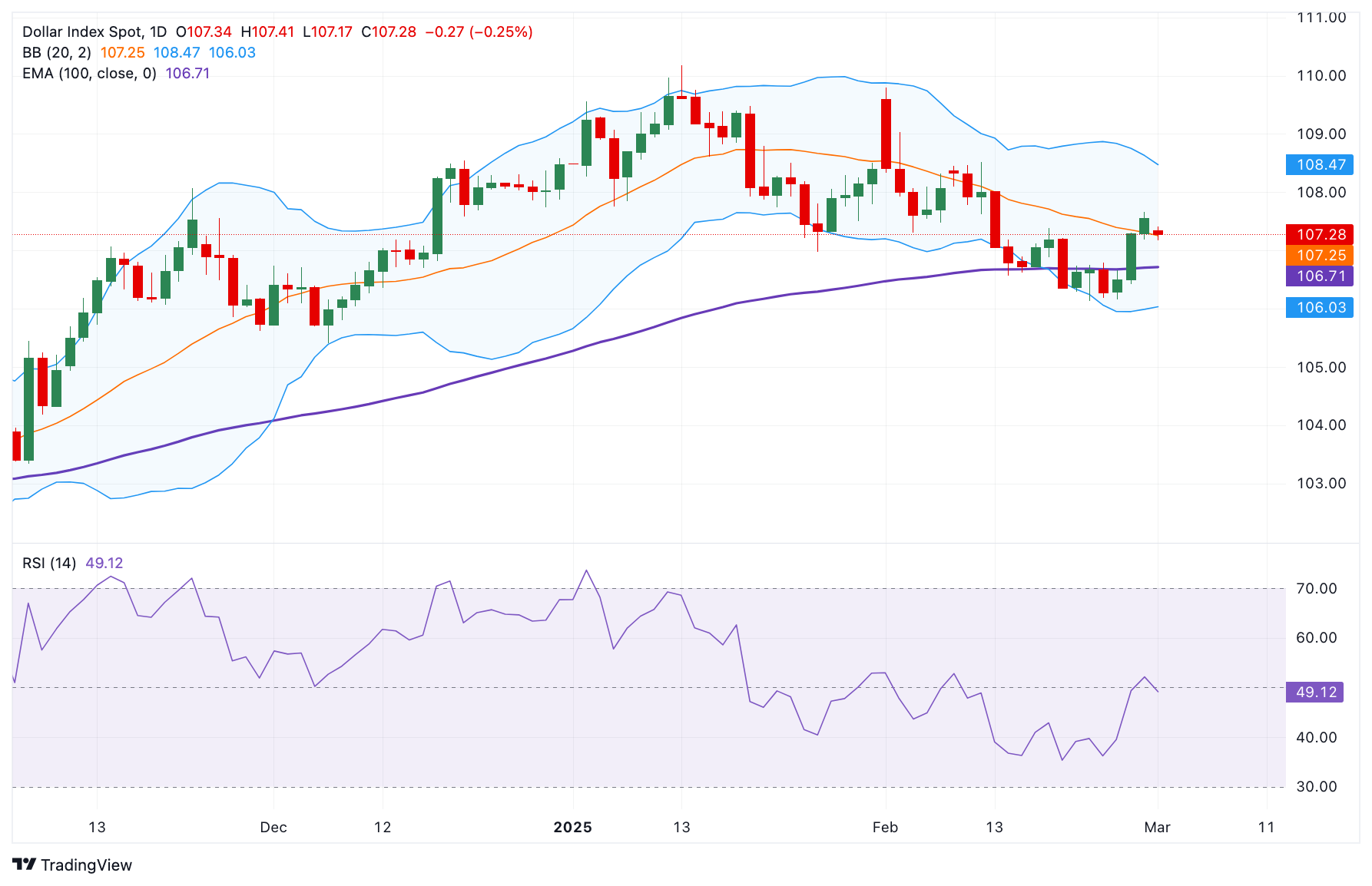 On the downside, initial support lies at the 100-day EMA of 106.70. A decisive break below this level may expose the key support at 106.00, which coincides with the lower Bollinger Band boundary. Further weakness could push the index toward 105.41, the December 6, 2024 low.