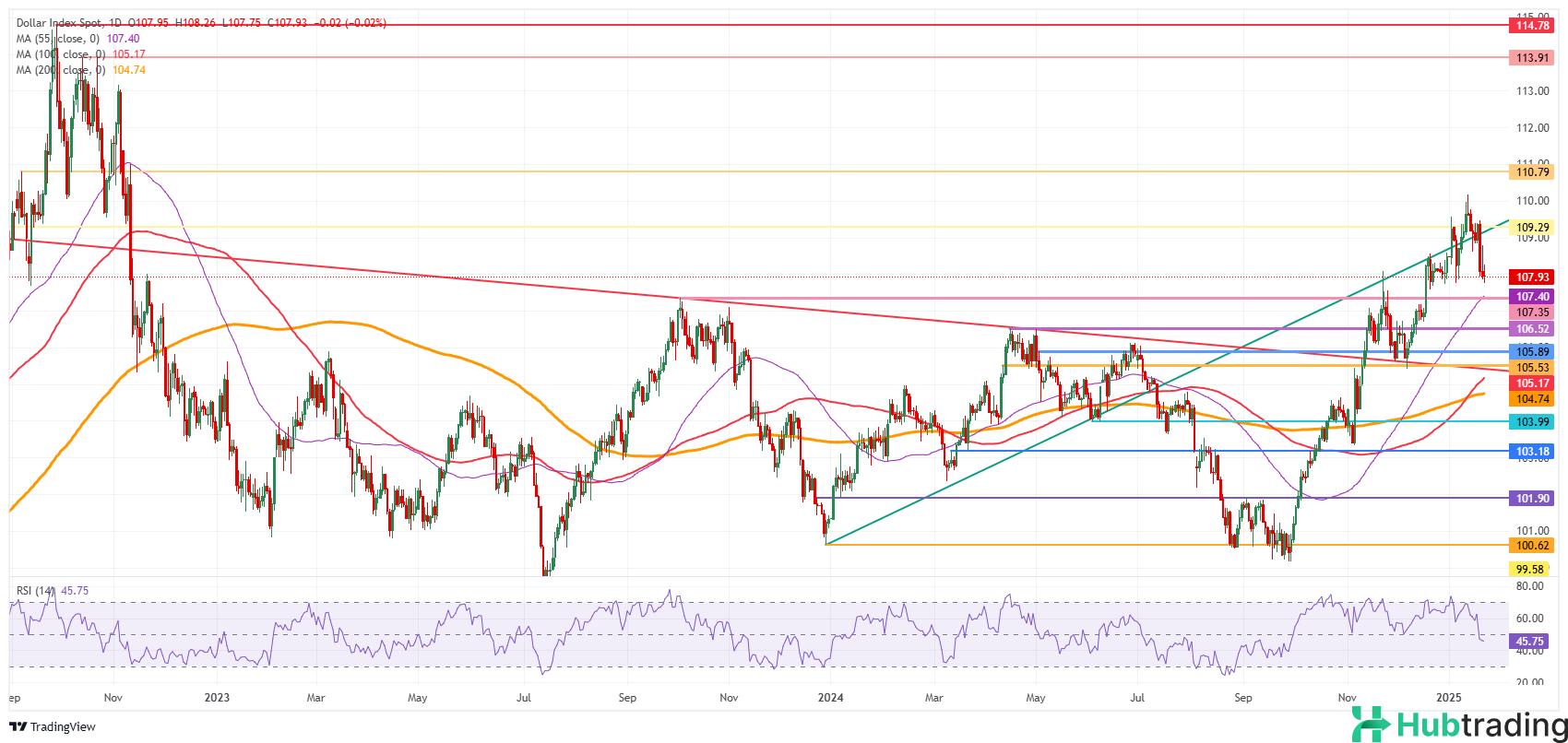 - The US Dollar Index (DXY) is testing the 108.00 level, with a potential move toward the lower 107.00 range.